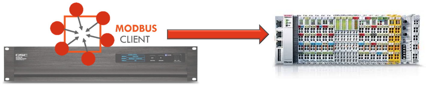 Programation offers two Modbus related plugins; a Server and a Client. It is often confused which one should be used for a project. The Modbus Client plugin allows a Q-SYS core to connect to some automation device, like a PLC, which is a Server Device. This is the best way to expand the Q-SYS system to incorporate control devices and allows the Core to act as the centralized point of control, making all logical decisions.